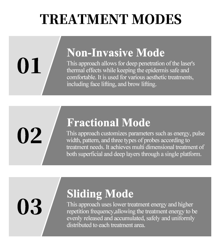 The 1927nm fractional mode is characterized by the use of a fractional handle to focus the laser onto a small spot (approximately 0.1-0.15mm in diameter) to irradiate the skin, achieving a non-ablative or micro-ablative effect, mainly for skin rejuvenation and wrinkle reduction. If the laser is applied for a long enough time, a micro-ablative effect is produced. If the duration of action and energy density are reduced, a thermal coagulation vertical band may be produced, which activates collagen and shrinks the skin.